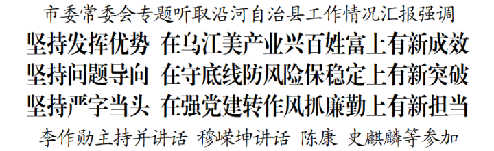 7月23日,市委常委會(huì)召開會(huì)議,專題聽取沿河土家族自治縣工作情況匯報(bào),研究解決困難問題。市委書記李作勛主持會(huì)議并講話,市委副書記、市長(zhǎng)穆嶸坤講話,市人大常委會(huì)主任陳康,市委副書記、石阡縣委書記史麒麟,市委常委,市政府有關(guān)負(fù)責(zé)同志發(fā)言。