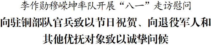 在中國人民解放軍建軍98周年之際,市委書記李作勛,市委副書記、市長穆嶸坤分別率隊到銅仁軍分區(qū)、武警銅仁支隊開展“八一”走訪慰問,代表市四家班子和全市各族干部群眾向全體駐銅人民解放軍指戰(zhàn)員、武警部隊官兵、軍隊文職人員、預備役人員和民兵致以節(jié)日祝福,向全市退役軍人和其他優(yōu)撫對象致以誠摯問候。市政協(xié)主席喻國君,市領導韓佐芝、董亮、侯剛、許飛、吳紹東、楊維權參加走訪慰問。董亮、許飛代表市委、市政府分別向銅仁軍分區(qū)、武警銅仁支隊贈送慰問品。