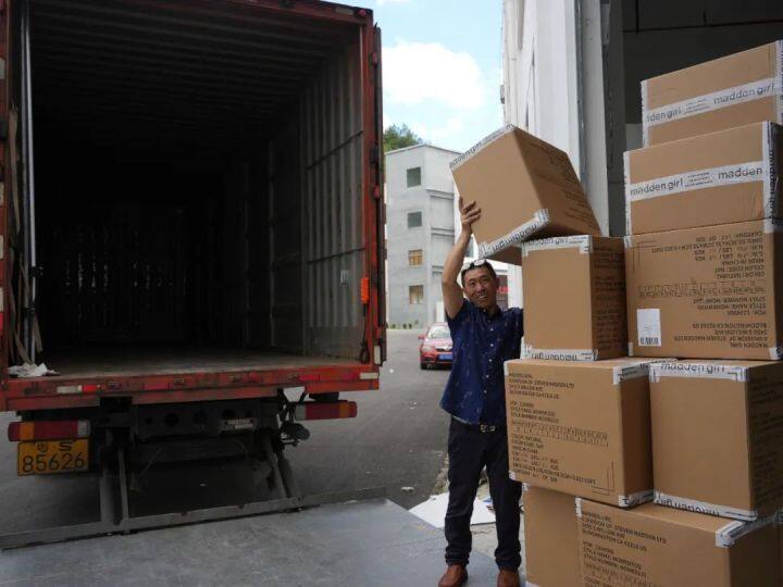 7月3日,銅仁市德江縣經(jīng)濟(jì)開發(fā)區(qū)北城產(chǎn)業(yè)園貴州龍威鞋業(yè)有限公司廠房外,工人們正把一箱箱包裝好的皮靴搬運到車上,這批皮靴將通過長途運輸?shù)诌_(dá)深圳港,隨后銷往美國。