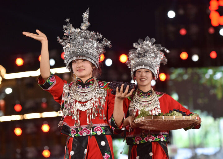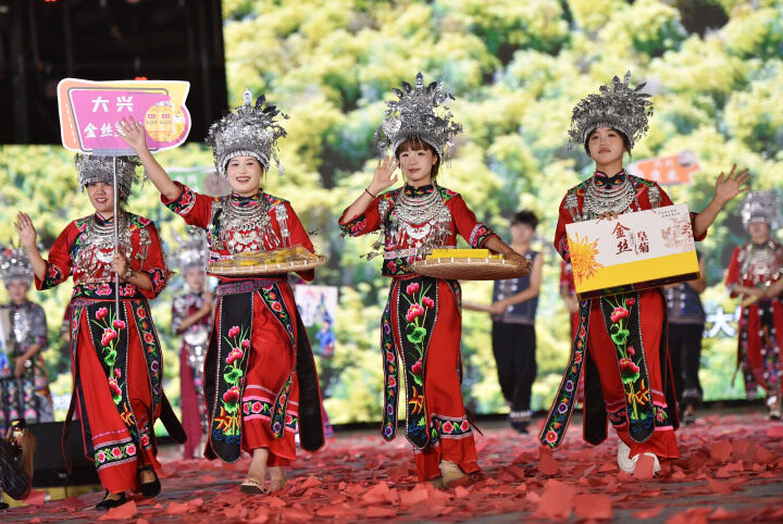 金絲皇菊,健康美味;自釀農(nóng)家酒,綿柔順滑;大興獼猴桃,云海深處自然熟,果肉翡翠透亮……7月5日晚,桃桃村晚·村村PK賽迎來第12期,松桃大興街道的80多名群眾身著苗族服裝、攜農(nóng)產(chǎn)品登上T臺,制作精美的苗繡、流光溢彩的銀飾,瞬間吸引全場目光,折射出松桃文化產(chǎn)業(yè)發(fā)展的活力。