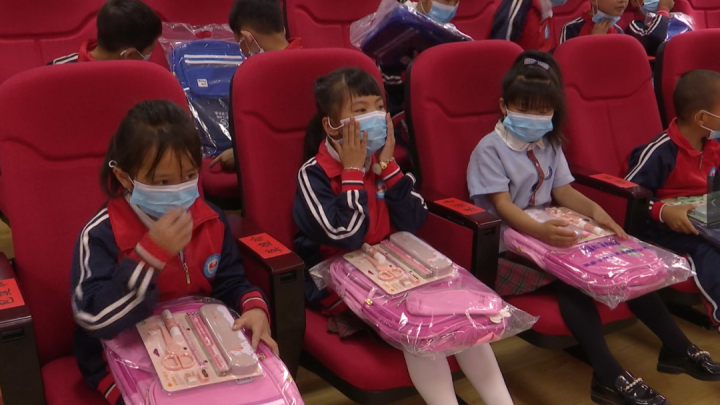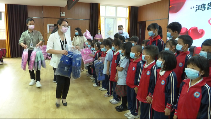 現(xiàn)場為在校學生帶來了精心準備的200個書包及200份文具用品等愛心物資。
